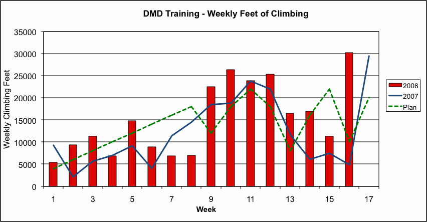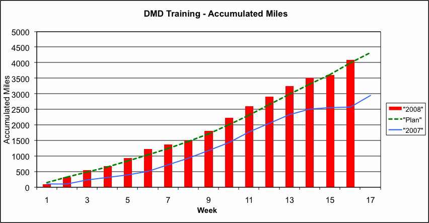 This one of the most difficult double centuries in California. With nearly 20,000 feet of climbing and 206 miles, it tests even the most advanced cyclists. In 2007 I finished the event but late a night after having a very difficult time. I had run the Boston Marathon less than two weeks earlier, which might be one factor for the poor showing. For 2008 I am focussed on doing a better job of training. These charts show my progress compared with my training program and also compared with 2007.
