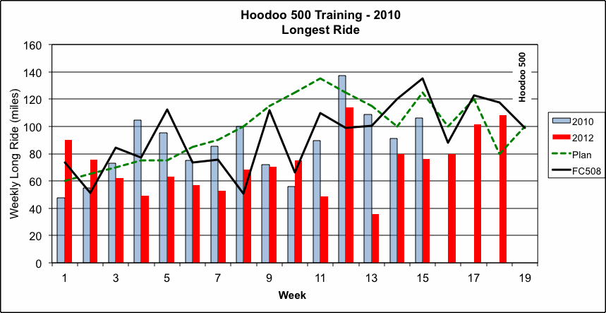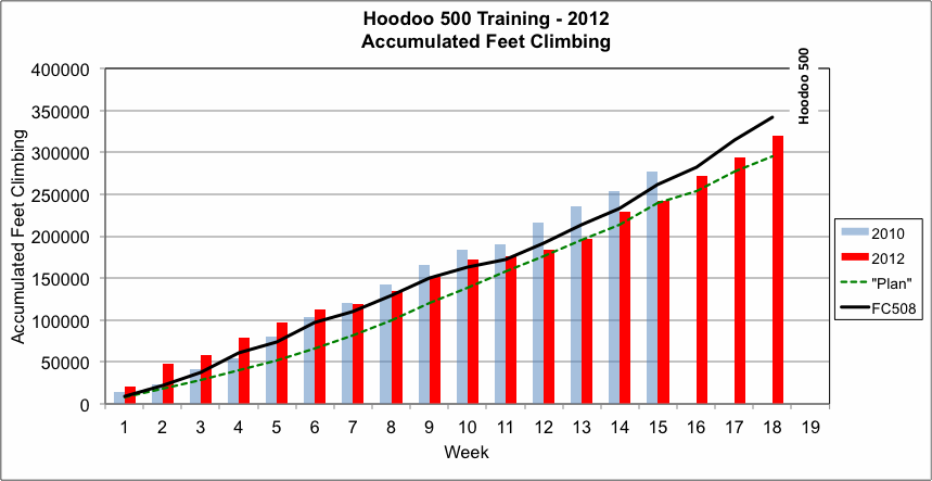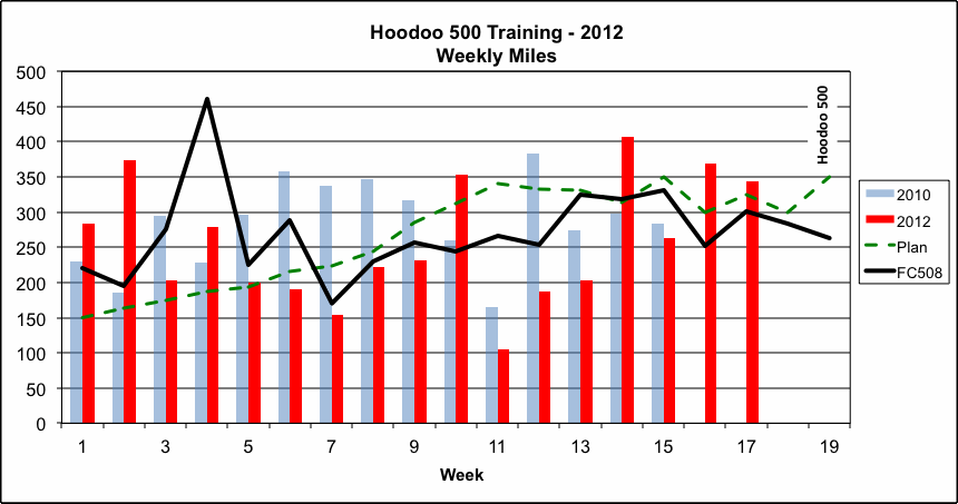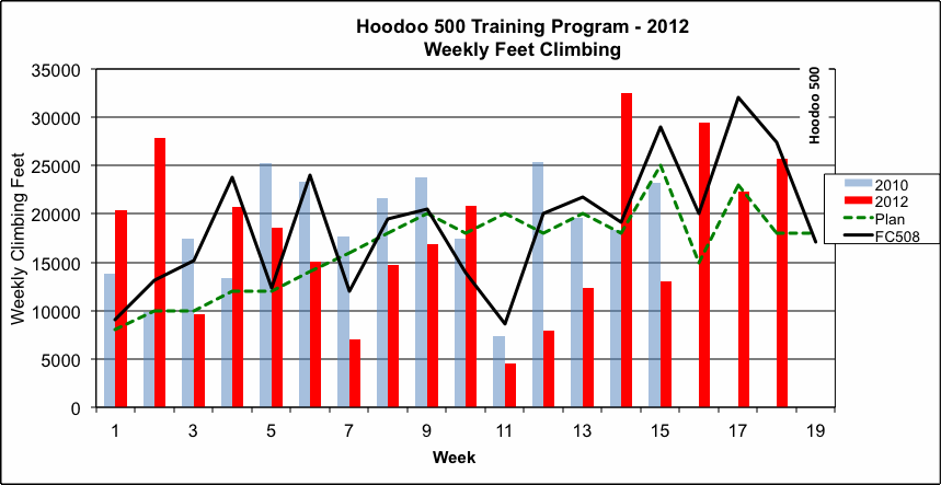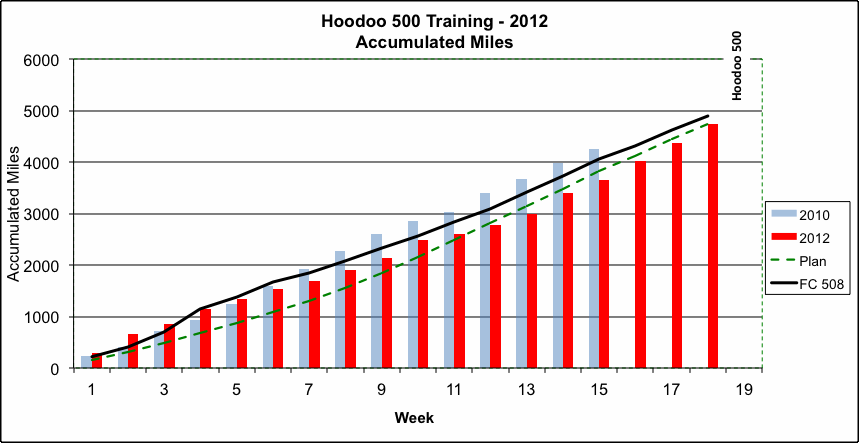 My training program is based on what I used before for the Furnace Creek 508, a similar event, which I competed in 2007 and 2008. The charts below show how I am doing as I work through this 19 week training program.